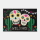 Day of the Dead art Welcome Door Mat. Welcome is lettered with bones and the design features floral sugar skulls, sugar skull bunting, flower garlands and cactus. Please browse my Dia de los Muertos collection for more items.