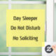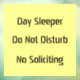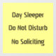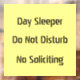 For night workers who sleep during the day to minimize the distubances of daily life so you can get some sleep this yellow and black design in a cool stencil lettering will alert solicitors and delivery people not to knock or ring your bell with the message: Day Sleeper, Do Not Disturb, No Solicitiing.