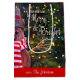 “May your days be merry & bright.” A close-up photo of a happy and cute, rustic log snowman, wrapped in a red and white striped scarf against lighted trees helps you usher in Christmas and New Year. Feel the warmth and joy of the holiday season whenever you use this cute and fun personalized medium size gift bag. Matching and coordinating cards, envelopes, stickers, pillows, housewares, jewellery, and other products are also available in my “Christmas Days Be Merry & Bright” store collection. Turns a great present into something even better!