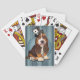 Superbe basset hound chiot avec chapeau haut, jouant aux cartes, dés, et bandes vintages bleues dans l'arrière - plan, peint par l'artiste Maryline Cazenave.