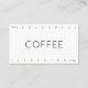 Le café est une boisson brassée à la saveur amère préparée à partir des graines rôties du plante de café. Les haricots se trouvent dans les cerises à café, qui poussent sur des arbres cultivés dans plus de 70 pays, principalement en Amérique latine équatoriale, en Asie du Sud-Est, en Asie du Sud et en Afrique. Le café vert (non grillé) est l'un des produits agricoles les plus échangés au monde. Idéal pour un café décontracté ou un expresso en voiture ou encore un café qui sert lattes, mochas et cappuccinos. Changez les chiffres si vous souhaitez offrir une boisson gratuite après moins (ou plus) de visites. Faites revenir vos clients pour plus de boissons de café de haute qualité et de spécialité!
