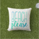 Ce coussin coloré comporte l'expression "plage svp" dans un ombre de turquoise. L'accent parfait à une salle orientée de plage.