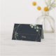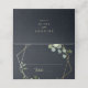 Cette carte de mariage géométrique bleu or est parfaite pour un mariage moderne. Le design présente de beaux feuilles verts peints à la main dans un arrière - plan bleu foncé, ornant un cadre géométrique doré. Personnalisez le dos de la carte avec les noms de la mariée et du marié et la date.