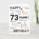 Carte d'anniversaire à l'intérieur : Que votre journée spéciale soit remplie de joie, de rire et de moments inoubliables que vous pouvez chérir pour les années à venir. Je vous souhaite tout le bonheur dans le monde pour votre anniversaire et toujours! Description : Commémorons l'incroyable 73ème anniversaire avec notre délicieuse carte Happy 73ème anniversaire ! Que ce soit pour votre mère chère, votre père bien-aimé, votre frère cher ou votre soeur bien-aimée, cette carte offre une belle avenue pour express vos souhaits sincères et les douche avec joie et amour lors de leur journée spéciale. Le recto de la carte affiche fièrement "Joyeux Anniversaire" aux côtés du nombre significatif de 73, représenté dans des décennies, des années, des mois, des semaines, des jours, des heures, des minutes et des secondes, soulignant l'importance de cette occasion capitale.