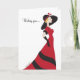 Fille dans une robe rouge vif et de longs gants noirs et portant un grand casquette noir avec un ruban rouge.