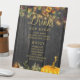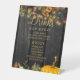 Badigeonnez de plantes botaniques florales et de citrouille orange rouillé sur un bois de grange foncé avec des lampes à cordes signe de boisson d'anniversaire.