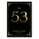 Cartes de numéro de table du mariage Great Gatsby Art Déco avec numéro d'or 53 et texte modifiable, où vous pouvez ajouter vos noms et date de mariage, imprimé sur arrière - plan noir