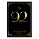 Cartes de numéro de table du mariage Great Gatsby Art Déco avec numéro d'or 92 et texte modifiable, où vous pouvez ajouter vos noms et date de mariage, imprimé sur arrière - plan noir