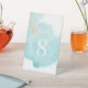 Un panneau de numéro de table d'aquarelle turquoise et aquarelle avec des accents dorés.