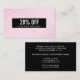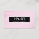 Carte de réduction ou de coupon de réseau girly moderne avec image numérique du motif de paillettes rose. Superposition à bande noire. Idéal pour les professionnels de la beauté, de la mode, du divertissement et des événements. Remarque : Séquin est un effet imprimé, aucune parties scintillant sur la carte. Idéal pour les salons de beauté, les spas, les cosmétiques, les esthéticiens, les studios de danse, les boutiques, les designers, les stylistes de cheveux et de mode ou tout autre professionnel de l'image. Idéal pour l'artiste ongle, le barbier, les boutiques de cadeaux et plus encore