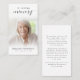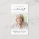 Funérailles En Mémoire Amoureuse Script Carte De Prière Photo. Gardez la mémoire d'un être cher proche avec cette carte de prière personnalisée avec une photo chère, le titre EN MÉMOIRE D'AMOUR, le nom et les dates et un message de souvenir chaleureux modifiable. Avec son design classique, simple mais élégant, noir et blanc et son script de calligraphie moderne avec des swashes, il fait un souvenir significatif à partager à un enterrement, service commémoratif ou Célébration de la Vie et offre le confort et un hommage durable pour la famille et les amis. Sa petite taille portable de 3,5x2" (taille porte-monnaie) permet aux proches de la porter avec eux pour rappeler la vie et l’esprit de l’être aimé.