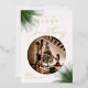 Diffusez la joie festive avec une carte de Noël photo personnalisée. Cette joyeuse carte de voeux de vacances comprend de l'espace pour une photo de famille, votre nom de famille et le design de verdure aquarelle. La véritable feuille d'or finit de cette carte festive qui en fait un super lux.