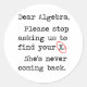 They are due for a strongly worded formal tshirt letter. Dear, Algebra, please stop asking us to find your ex. She's not coming back. You big nerd.