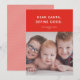 This cute, funny holiday photo card features a festive red background, simple white type, and a single photo. The greeting reads "Dear Santa, define good." This design would also be perfect for a pet card, but also works great for mischievous adults! The backer features a simple red and white diagonal stripe patter that can be customized or removed. To customize this design further, you could remove the backer pattern in favour of another photo or additional text.