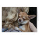 charlie chihuahua enjoys a cuddle with his owner, a sweet blonde girl - it was time to say goodbye for some time, they will miss each other a lot - but their love will stay