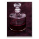 Flacon tenant du sang mousseux, sur une nappe rouge bordeaux. Beaucoup de petites araignées noires rampent autour et un seul rose noir se couche sur la table.