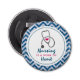Un ouvre-bouteilles avec un motif en faux parties scintillant de chevron bleu. Pas de parties scintillant réelle, juste une image. En haut, un cadre rond et à l'intérieur, le dicton : L'allaitement est un travail de coeur, avec un petit coeur rouge et un stéthescope gris.