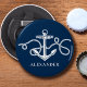 Cet ouvre-bouteille à bouton personnalisé a un design d'ancre nautique classique sur un arrière - plan bleu marine.