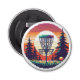 Illustration d'un parcours de golf à disques avec panier, pins et couché de soleil dans un style de vibes de jeu d'art 8 bits.