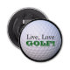Cet ouvre-bouteille rond a une image d'une balle de golf blanche sur un arrière - plan noir avec un texte qui dit, "Vis, Amour, GOLF !" sur elle en lettres noires et vertes. Il ferait un ajout amusant au sac de golf, à la grotte de l'homme, à la tanière ou à la salle de rec et fait un grand cadeau pour le golfeur passionné.