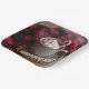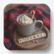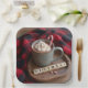 A black and red buffalo plaid blanket with a mug of hot chocolate topped with whipped cream and a candy cane on a wooden tray