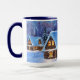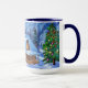 Mug for coffee, tea, hot chocolate, milk, or juice. With cute December winter Holiday scene of a log cabin in a snow covered forest landscape and a Christmas tree decorated with colourful lights and ornaments.