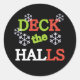 Red, green, and white text with white snowflakes reads "Deck the Halls" on holiday T-shirts, tote bags, mugs, magnets, and more.
