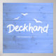 Fun maritime poster with the word Deckhand written in a funky white font. Cool aqua blue wood effect background and white seagulls flying above. Great for maritime and coastal themed rooms, beach houses and beach bars. Look out for co-ordinating products within my store.