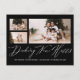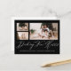 This simple photo collage Christmas moving announcement features a minimalist black and white design with three photos and elegant white calligraphy script. This modern Seasonal holiday change of address announcement postcard features an editable Christmas greeting message on the back of the postcard with your new return address.