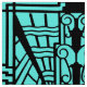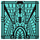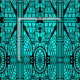 Fabric in a pattern based on Art Deco architectural details - black on a turquoise / peacock background