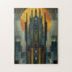 modern digital art with tall facade of art deco style building at night with large golden moon and spotlights.
