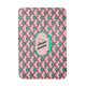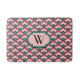 Chinese scallop, or wave pattern, traditional in textile and enamel work, bath mat with monogram in shades of coral pink, black, and accents of turquoise / peacock