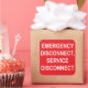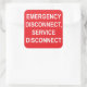 Une feuille de six, 3" x 3" DÉCONNEXION D'URGENCE, étiquettes d'autocollants SERVICE DISCONNECT à utiliser par les électriciens pour satisfaire aux exigences de l'article 230.85(E)(1) et (2) du Code national de l'électricité de 2023.
