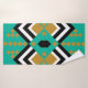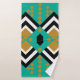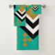 Ce kit de serviettes est décoré dans un style art déco avec des formes diamant en noir, blanc et or sur un champ de turquoise.