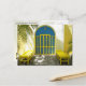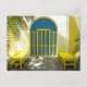 Decorated blue door with yellow benches postcard