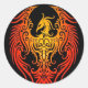 This red and yellow phoenix design is decorated with flowing tribal swirls and dot patterns. The symmetrical wings extend out from each side of the pattern while the tail falls down the center forming a point at the base. The bold lines are highlighted which creates a subtle shine on the surface. This aggressive yet elegant phoenix sits on a pure black background which creates a beautiful and stylish sticker design.