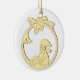 Décoration de Noël en céramique , lutin assis dans une boule décorée de rubans et de feuilles de houx , fond blanc ou pouvant être coloré.