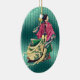 Art vintage avec une belle dame orientale avec ventilateur sur un motif vert d'aqua qui rappelle les paillettes ou les écailles de dragon. Ses cheveux longs et ses robes tourbillonnent gracieusement de son élégante silhouette.