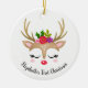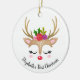 Un joli visage de rennes orne le premier ornement de Noël de cette petite fille. Personnalisez-le avec votre nom de bébé filles sur le devant et le dos. Conçu pour vous par Blackberry Boulevard.
