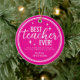 Best Teacher Ever Pink Script Retro Ceramic Ornament. Celebrate your amazing teacher with this heartfelt 'Best Teacher Ever' ornament! This vibrant pink, text-based design features elegant white script proclaiming gratitude and appreciation. It also includes a space for a personalized message, and space for the student's name, making it a truly special keepsake. This ornament is a perfect way to show your teacher how much they mean to you and acknowledge their dedication to helping students flourish. It's an ideal holiday or Christmas gift to commemorate their impact.