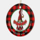 Un long gnome de Noël barbu et drôle tient une série de fleurs de poinsettia au centre de ce joli ornement de Noël. Le petit gnome porte un chapeau de Santa plaid rouge avec une cloche à la fin. L'image est placée sur un arrière - plan blanc et encadrée en vert de Noël. Le texte de la coutume en blanc en bas dit "Joyeuses fêtes du (nom)" sur une bordure de cercle rouge et noir de buffle plaid. L'arrière a la même image et la même bordure avec un autre champ de texte que vous pouvez customiser.