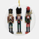 Cet ornement d'arbre présente trois soldats de Noisettes de Noël colorés, traditionnels, en bois, un avec une hache, un avec des cymbales et un avec une épée.