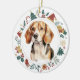 Ce joli ornement de vacances présente une aquarelle d'un beau chien Beagle Hound. L'image est encadrée dans une couronne de cercle colorée constituée de diverses images de vacances, dont un bonhomme de neige, des cloches, du sucre de canne, du stockage, du saint, et plus ! L'arrière de l'ornement a la même image de couronne avec votre texte personnalisé en vert, or et rouge.