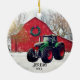 Le tracteur vert préféré d'un fermier est garé devant une vieille grange rouge dans la neige.
