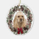 Sur le devant de cet ornement de vacances est l'image d'un coq Spaniel Dog bouffé encadré par un joli cône de pin aquarelle et une couronne de fruits Holiday. L'image du chien est au centre sur un arrière - plan blanc. Un arc rouge brillant donne un peu d'éclat de Noël à la couronne. Le dos de l'ornement a la même couronne avec votre texte personnalisé en rouge et vert foncé.