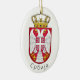Célébrez l'héritage serbe avec cet élégant ornement en céramique représentant le drapeau national de la Serbie. Le design met en valeur le classique tricolore horizontal rouge, bleu et blanc, orné des armoiries mineures décalées vers le côté de la hampe. L'héraldique comprend l'aigle blanc bicéphale iconique sur un bouclier rouge, surmonté d'une majestueuse couronne royale, représentant la longue et riche histoire souveraine de la nation.