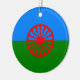 Ce dessin est orné du drapeau romani, qui est le drapeau international du peuple romani. Le drapeau est constitué d'un arrière - plan de bleu et de vert, représentant respectivement les cieux et la terre ; il contient également un chakra rouge à 16 branches, ou carrousel, au centre, qui représente la tradition itinérante du peuple romani et est aussi un hommage au drapeau de l'Inde. Le drapeau a été approuvé par les représentants de diverses communautés roms lors du premier Congrès mondial des Roms (WRC), qui s'est tenu à Orpington en 1971.