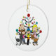 Stick figure family with dad, mom, two children...a boy and a girl, and two family dogs in front of holiday tree.