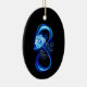Luminous infinity symbol with glowing, beautiful, lushly blooming rose made of blue flames on black background.
