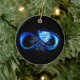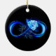 Luminous infinity symbol with glowing, beautiful, lushly blooming rose made of blue flames on black background.